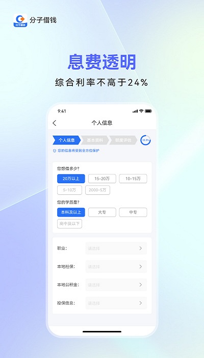 分子借钱是一款为个人消费者、小微企业、个体工商户提供互联网借贷服务的一站式信贷服务平台,专业大数据智能推荐,0-20万信用借款额度选择;利率低,下款快,轻松解决资金周转难题。